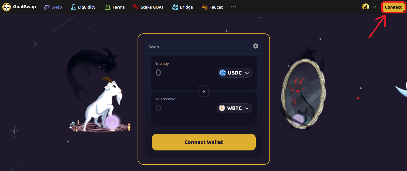 - After clicking Connect, your wallet should be connected to the GoatSwap, and you should see this window open.