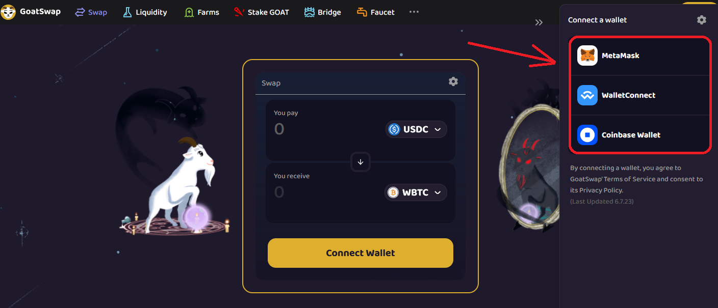To use GoatSwap, you need a MetaMask wallet (or any other browser wallet) connected to a supported blockchain. For information on MetaMask, visit their website. MetaMask by default only supports the Ethereum network. However, when you connect MetaMask to GoatSwap, it will automatically configure MetaMask to work with the GoatNetwork.