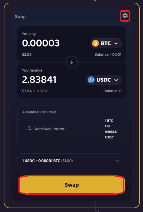 - Go to the Swap page on GoatSwap (make sure your wallet is connected).