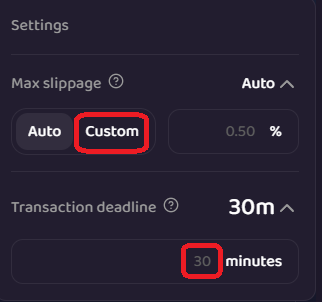 - Choose the amount you want to swap and click “Swap”. Above the “Swap” button, you will see how much your tokens are worth compared to each other. You can also change slippage from automatic to custom and select a transaction deadline limit by clicking settings in the upper right corner.