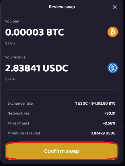 - After clicking the “Swap” button, you will get a pop-up review window to confirm the details of your transaction. Once you’ve confirmed everything is in order, click “Confirm swap”.