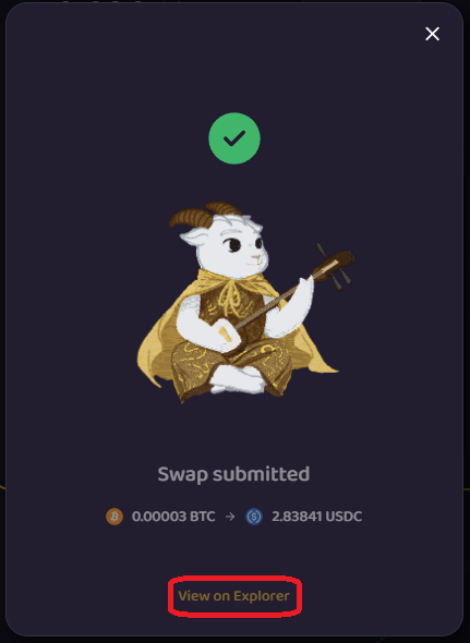 - After you have confirmed the transaction in your wallet, you should see the “Swap submitted” screen when your transaction has been sent to process. To check on the progress, you can click on “View on Explorer” or view the activity link in your wallet.